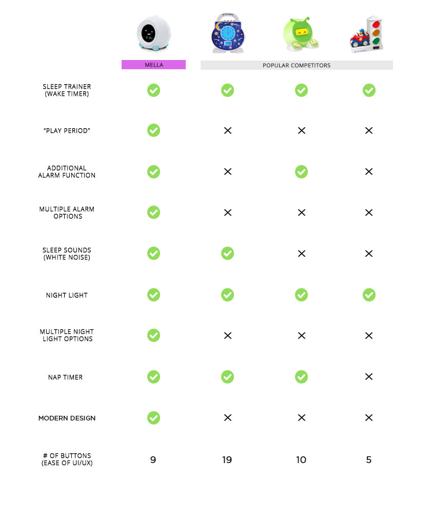 Studies show that children do not fully understand the concept of time until around 8 years old. MELLA uses colors and facial expressions to teach your kid when it's time for bed and when it's okay to wake up. With MELLA, your kid can learn to stay in bed longer, giving you more sleep!